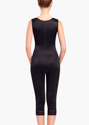 Компрессионное белье ниже колен с абдоминальным усилением и с закрытой спиной рекомендуется для использования в послеоперационный период после липомоделирования бедер, колен, внутренней поверхности бедер, живота, области галифе, ягодиц или абдоминопластики. Бандаж изготовлен из эластичной ткани, имеет регулируемую застежку (3 ряда) на крючках.
