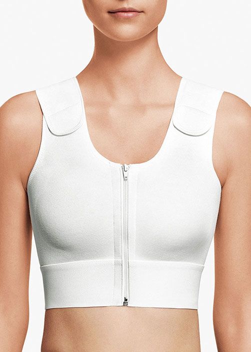 Лиф-топ хлопковый; чашечки бесшовные, уплотненные; застежка-молния расположена спереди; длина лямки регулируется застежками-липучками. Рекомендуется в восстановительный период после аугментационной и редукционной маммопластики.